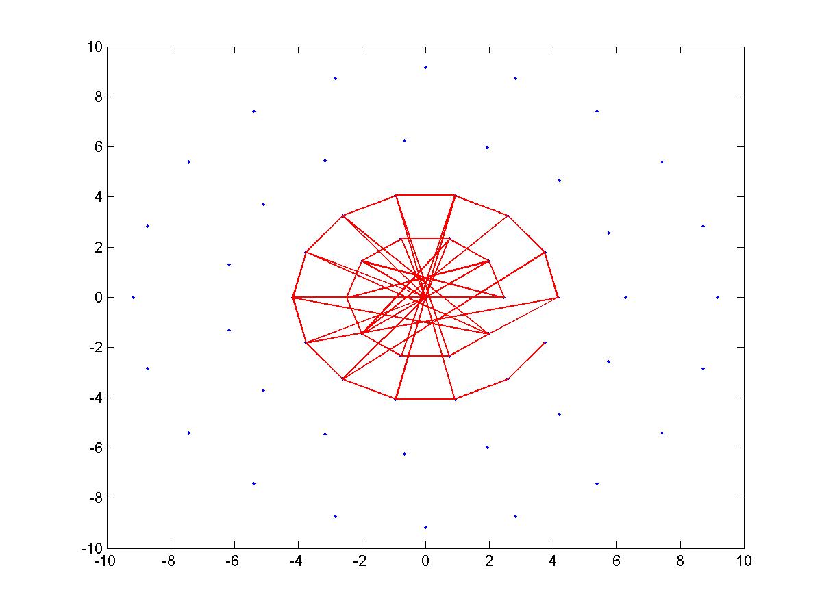 Next, choose, say, 512 pairs of points on this sampling pattern. Now go over all the pairs and compare the intensity value of the first point in the pair with the intensity value of the second point in the pair – If the first value is larger then the second, write ‘1’ in the string, otherwise write ‘0’. That’s it. After going over all 512 pairs, we’ll have a 512 characters string, composed out of ‘1’ and ‘0’ that encoded the local information around the keypoint. In the first figure of the post is BRISK’s pairs and  Below you can take a look at FREAKS’s pairs: